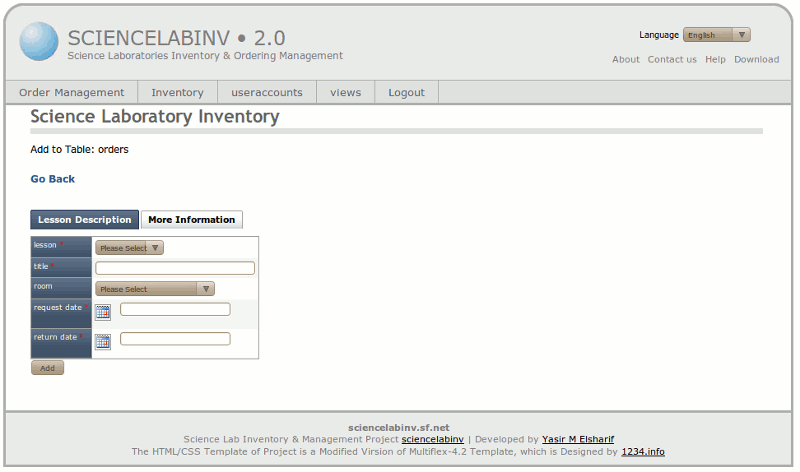 In the add orders page, you will notice in first figure below that you need to choose the lesson and room to which the order applies. There are drop down menus for each of these. The 'request date' is the date that you will be using the equipment and the 'return date' is the date the equipment should be removed from the laboratory.